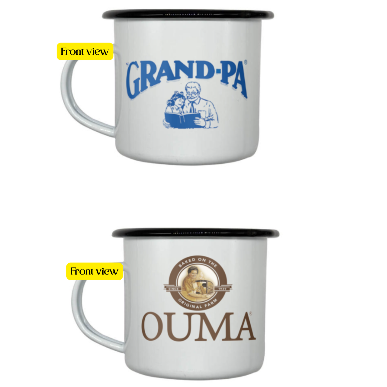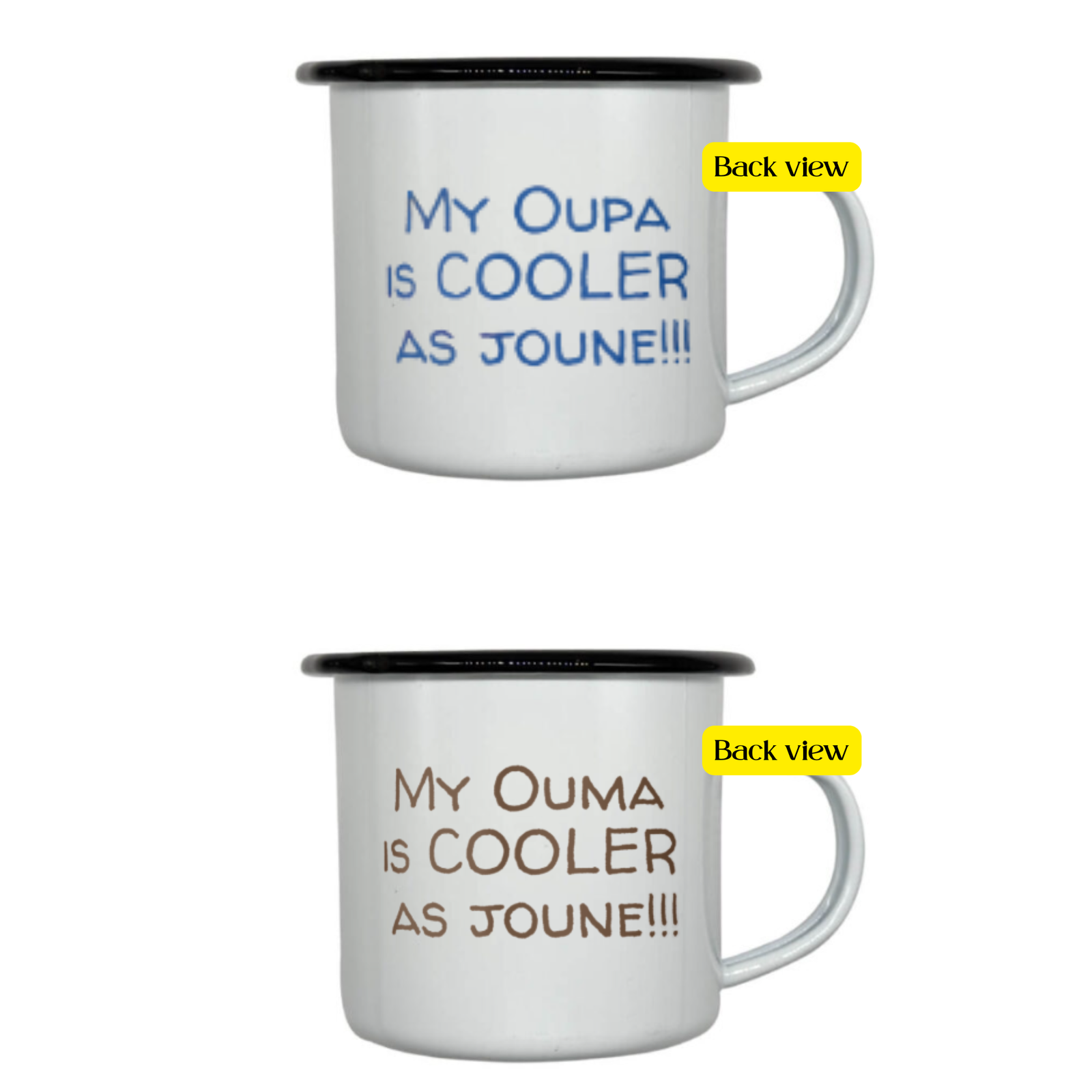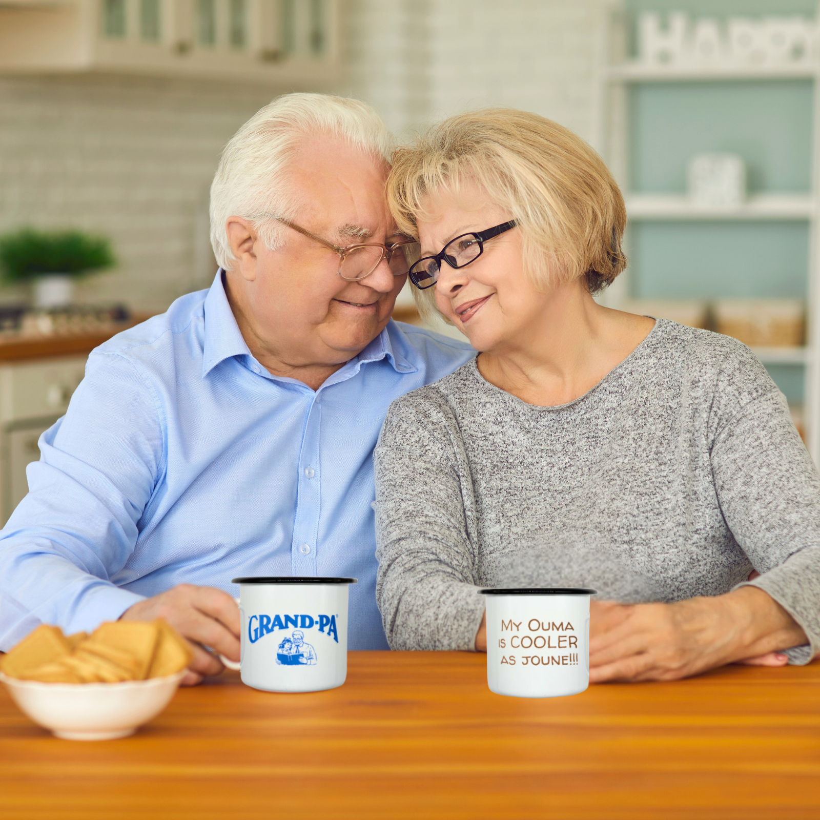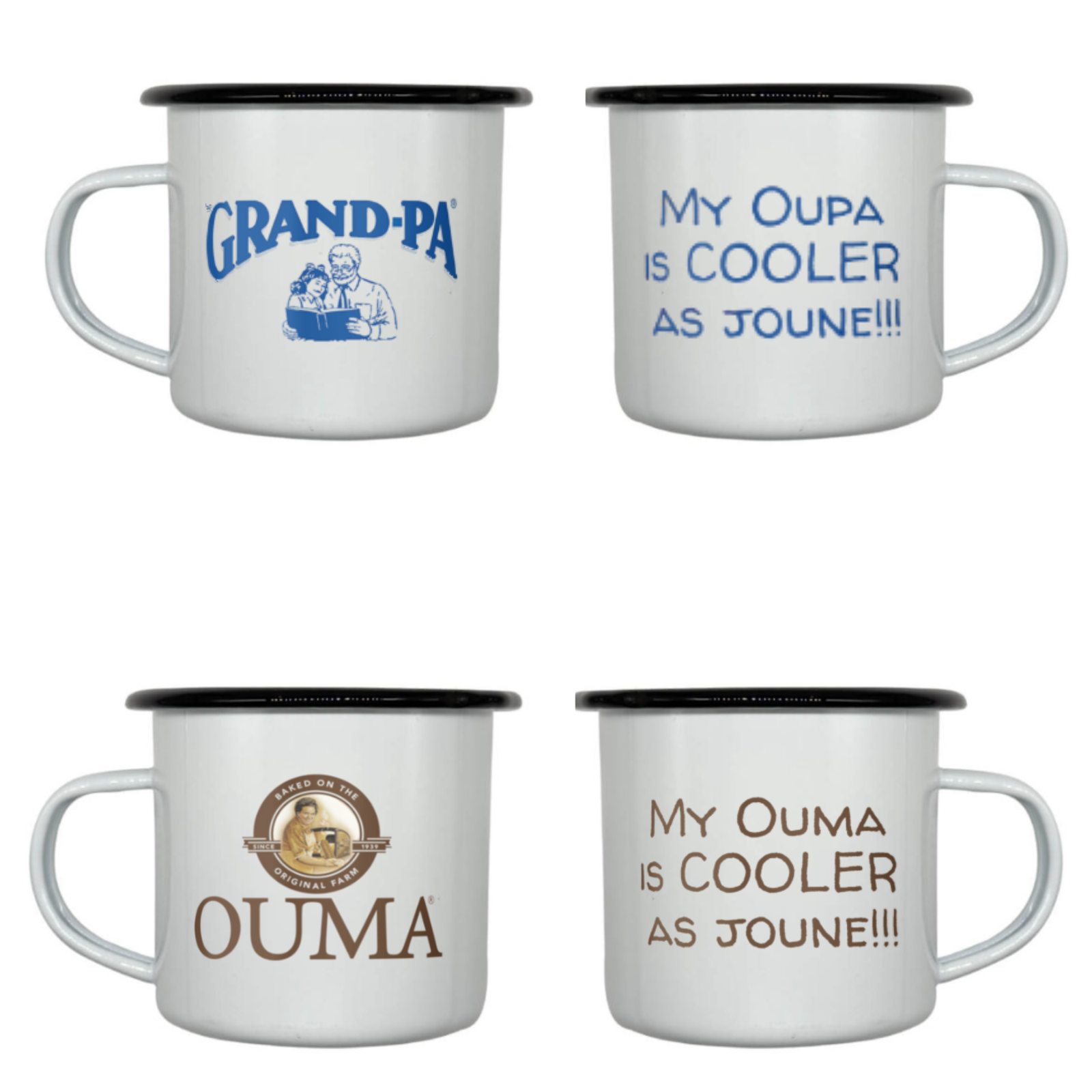 Printed Enamel mug set in Afrikaans for Grandpa and Grandma