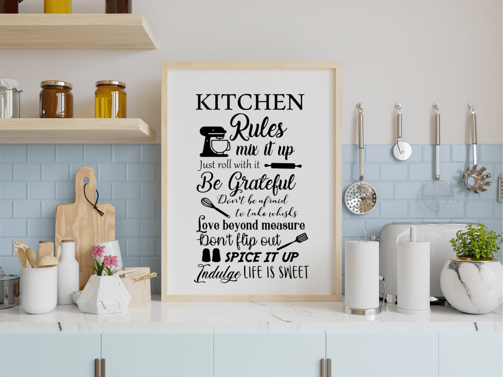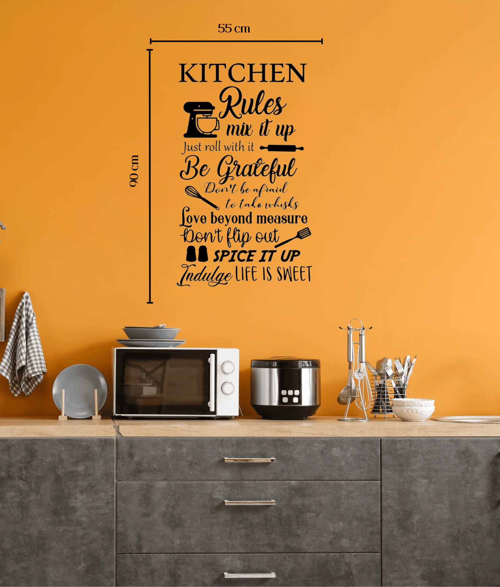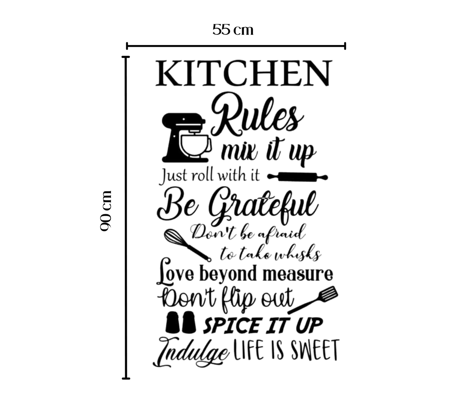 Transform your kitchen into a warm and inviting space with this charming Kitchen Rules Wall Decal. Featuring a collection of fun, motivational quotes and stylishly illustrated cooking utensils, this decorative sticker brings both personality and inspiration to your cooking area. Crafted in eye-catching fonts and modern black color, it seamlessly complements any kitchen décor style. Measuring a generous 55 cm by 90 cm, it’s ideal for placing above countertops, kitchen tables, or anywhere you want to create a welcoming vibe. Easy to apply and remove, this decal is a perfect gift for home chefs or anyone looking to brighten their kitchen. Choose this delightful accent for a unique and uplifting kitchen makeover today!